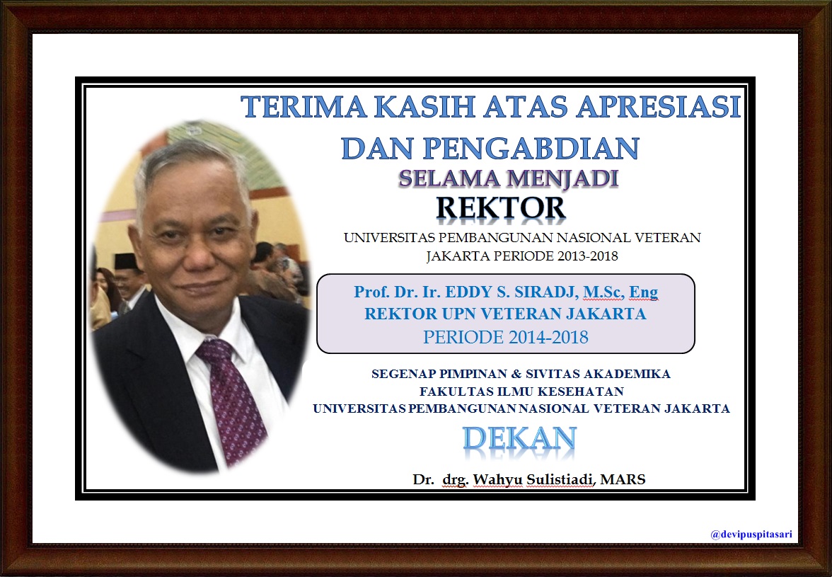 SEGENAP PIMPINAN & SIVITAS AKADEMIKA FAKULTAS ILMU KESEHATAN UNIVERSITAS PEMBANGUNAN NASIONAL VETERAN JAKARTA MENGUCAPKAN : TERIMA KASIH ATAS APRESIASI DAN PENGABDIAN SELAMA MENJADI REKTOR Prof. Dr. Ir. EDDY S....