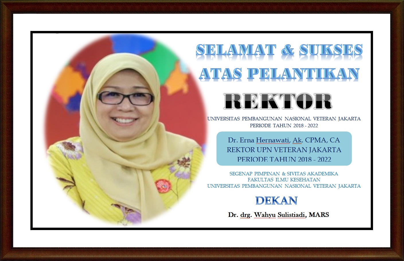 SEGENAP PIMPINAN & SIVITAS AKADEMIKA FAKULTAS ILMU KESEHATAN UNIVERSITAS PEMBANGUNAN NASIONAL VETERAN JAKARTA MENGUCAPKAN : SELAMAT DAN SUKSES ATAS PELANTIKAN Dr. Erna Hernawati, Ak, CPMA, CA REKTOR UNIVERSITAS PEMBANGUNAN NASIONAL...