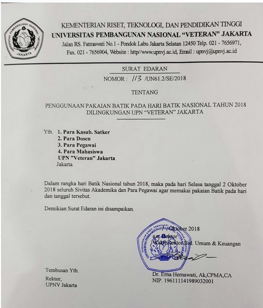 Surat Edaran Nomor 113/UN61.2/SE/2018 Tentang Penggunaan Pakaian Batik Pada Hari Batik Nasional Tahun 2018 dilingkungan UPN "Veteran" Jakarta
