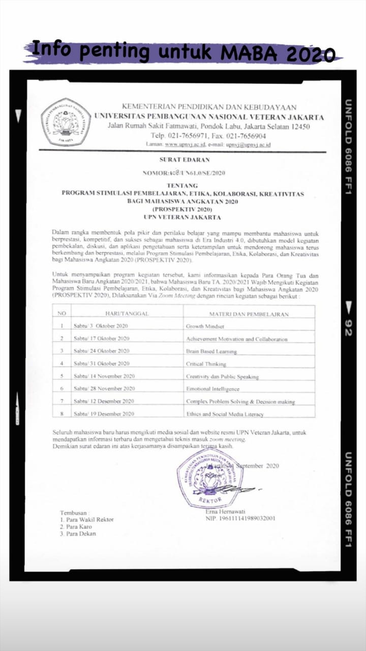 FIKES UPNVJ – Berdasarkan Surat Edaran Nomor : 108 / UN61.0/SE/2020 tentang Program Stimulasi Pembelajaran, Etika, Kolaborasi, Kreativitas, Bagi Mahasiswa Angkatan 2020 |(PROSPEKTIV 2020) UPNV VETERAN JAKARTA