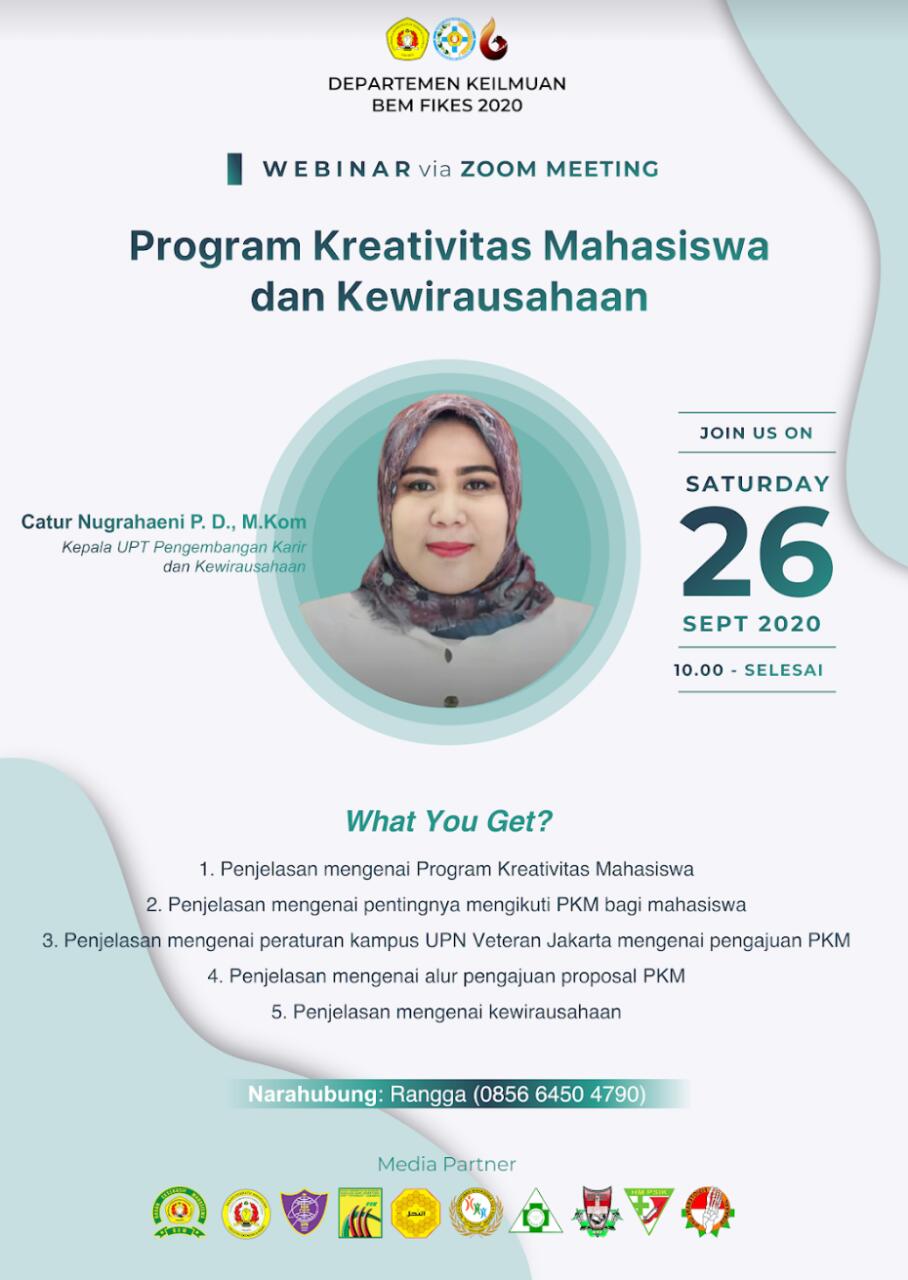 FIKES UPNVJ - Pada hari Minggu, 27 September 2020 telah berlangsung kegiatan Sosialisasi Program Kegiatan Kreativitas Mahasiswa 2019/2020 yang dilaksanakan 2 gelombang. Kegiatan ini diselenggarakan oleh anggota Himpunan Mahasiswa...
