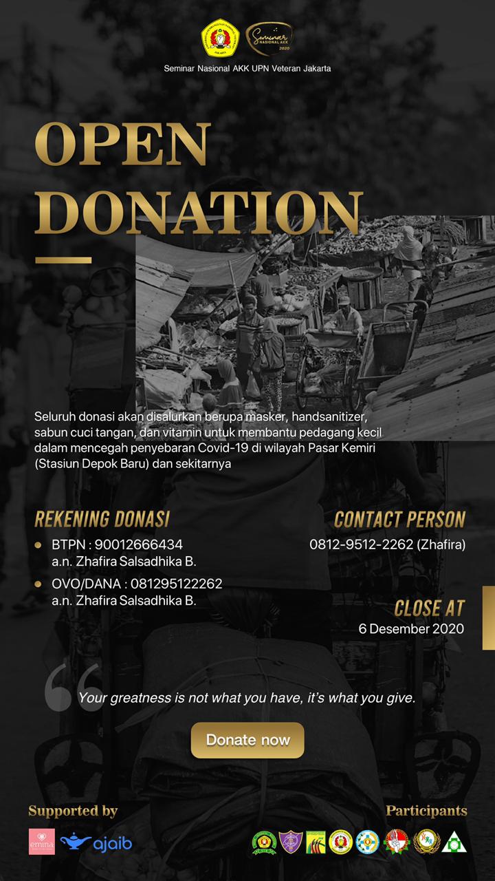 FIKES UPNVJ – Kepada Seluruha Civitas Akademi Fakultas Ilmu Kesehatan Universitas Pembangunan Nasional Veteran Jakarta Program Studi Kesehatan Masyarakat Program Sarjana membuka Open Donation, Seluruh donasi akan dislaurkan berupa...