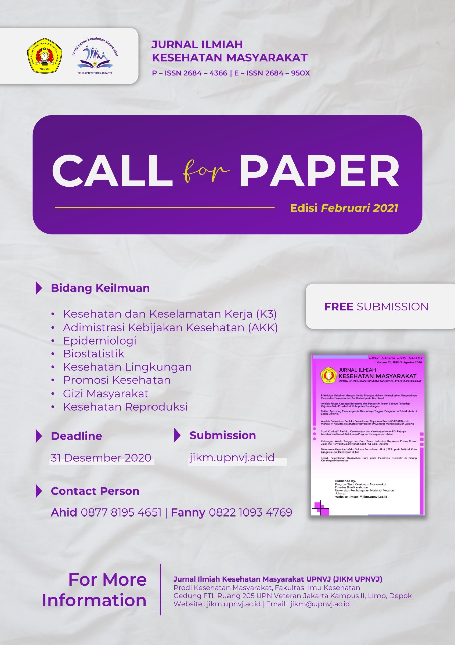 FIKES UPNVJ – Call for Paper! Volume 13, Edisi 1, Februari 2021 Jurnal Ilmiah Kesehatan Masyarakat UPNVJ (JIKM UPNVJ) menerima original article, laporan kasus, literature review, systematic review dalam...