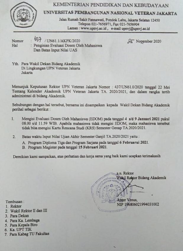 FIKES UPNVJ – Berdasarkan Surat Nomor 197/UN61.1/AKPK/2020 tentang Pengisian Evaluasi Dosen Mengajar yang dilakukan oleh Mahasiswa dan Batas Input Nilai UAS oleh Dosen. Surat terlampir dibawah ini