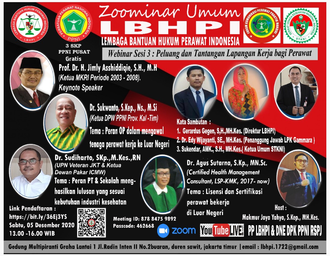 FIKES UPNVJ – ZOOMINAR UMUM LBHPI ( Lembaga Bantuan Hukum Perawat Indonesia ) Sesi 3 "Peluang dan Tantangan Lapangan Kerja bagi Perawat” ======================== Sabtu, 05 Desember 2020 14:00 – 16:00 WIB ========================...