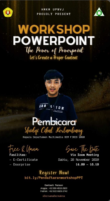 FIKES UPNVJ – Workshop Powerpoint HMKM UPNVJ dengan tema "The Power of Powerpoint" akan diselenggarakan pada 28 November 2020 menggunakan platform Zoom Meeting yang dapat diikuti oleh seluruh mahasiswa dari...