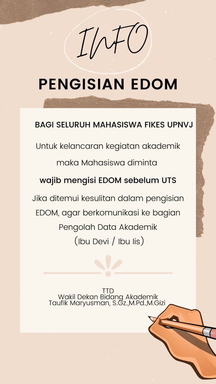 FIKES UPNVJ – Kepada Seluruh Mahasiswa Aktif Fakultas Ilmu Kesehatan Universitas Pembangunan Nasional Veteran Jakarta Untuk kelancaran kegiatan akademik maka Mahasiswa diwajibkan mengisi Evaluasi Dosen Mengajar (EDOM) sebelum Ujian Tengah Semester...