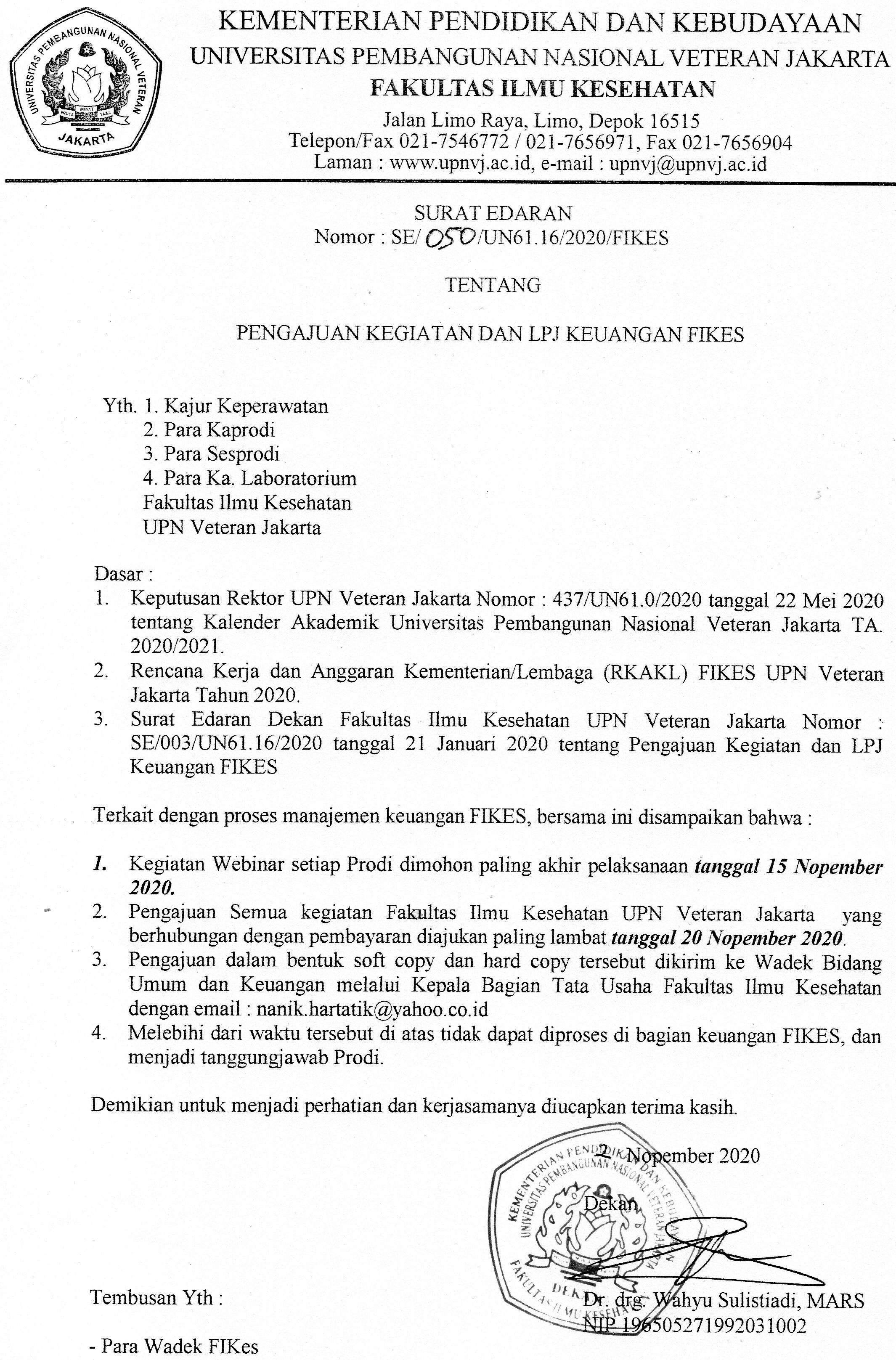 FIKES UPNVJ – Berdasarkan Surat Edaran Nomor : SE/050/UN61.16/2020/FIKES tentang Pengajuan Kegiatan dan LPJ Keuangan FIKES Surat terlampir
