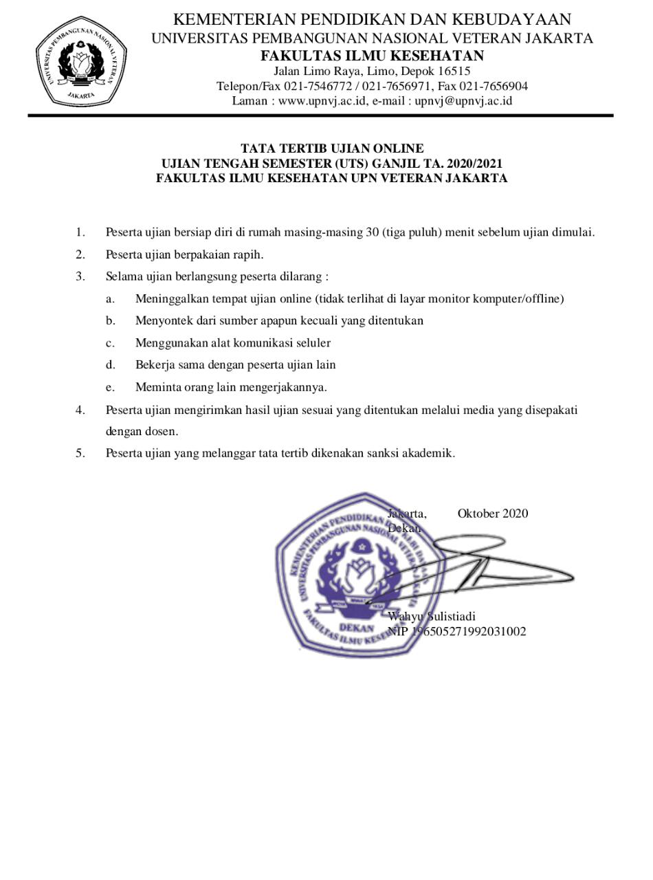 FIKES UPNVJ – Tata Tertib Ujian Tengah Semester, Semester Ganjil TA. 2020/2021 Secara Online di Lingkungan Fakultas Ilmu Kesehatan Universitas Pembangunan Nasional Veteran Jakarta. berikut tata tertib yang harus di...