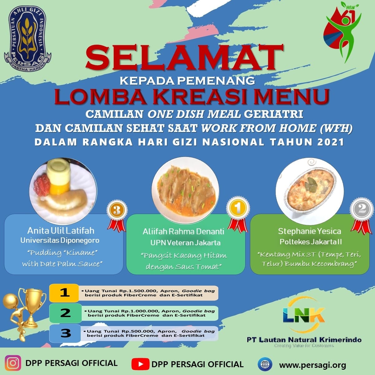 FIKES UPNVJ – Selamat Kepada Mahasiswa Program Studi Gizi Program Sarjana Alifah Rahma Denanti 1510714063 yang mendapatkan Juara 1 dalam Lomba Kreasi Menu Camilan One Dish Meal Geriatri dan Camilan...