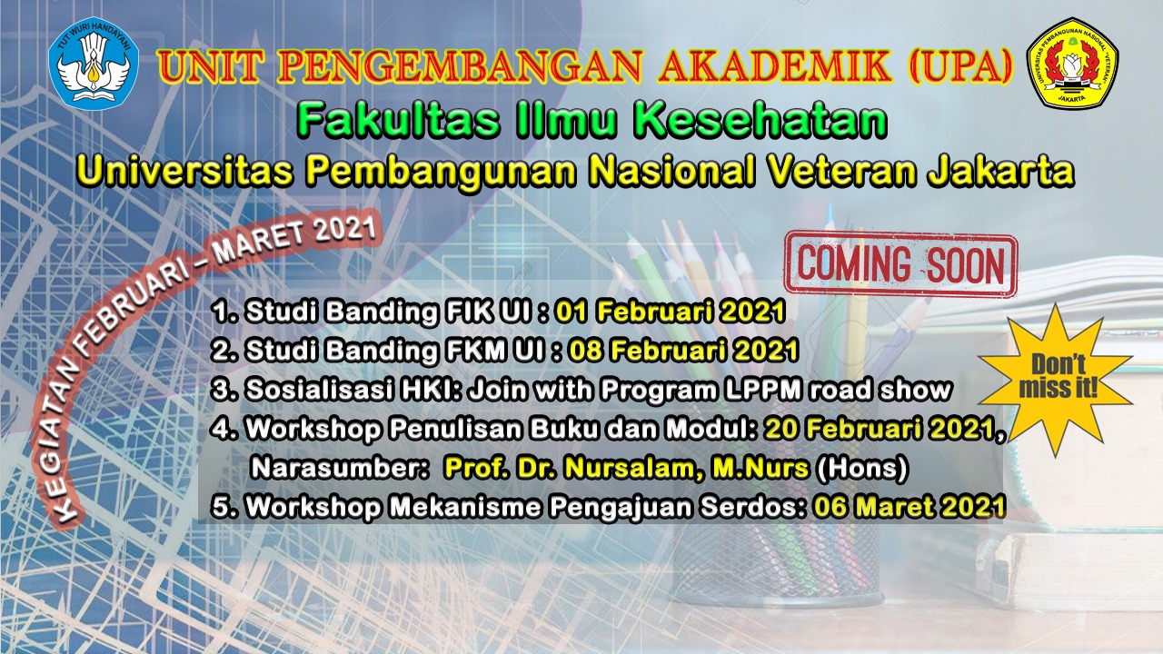 FIKES UPNVJ – Unit Pengembangan Akademi (UPA) Fakultas Ilmu Kesehatan Universitas Pembangunan Nasional Veteran Jakarta berikut jadwal Kegiatan Unit Pengembangan Akademi (UPA) dari Februari – Maret 2021