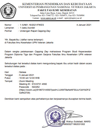 FIKES UPNVJ – Pada hari ini, Selasa 5 Januari 2021 pukul 10.00 WIB sd 12.00 WIB Fakultas Ilmu Kesehatan Universitas Pembangunan Nasional Veteran Jakarta telah melaksanakan Rapat Koordinasi Capping Day...