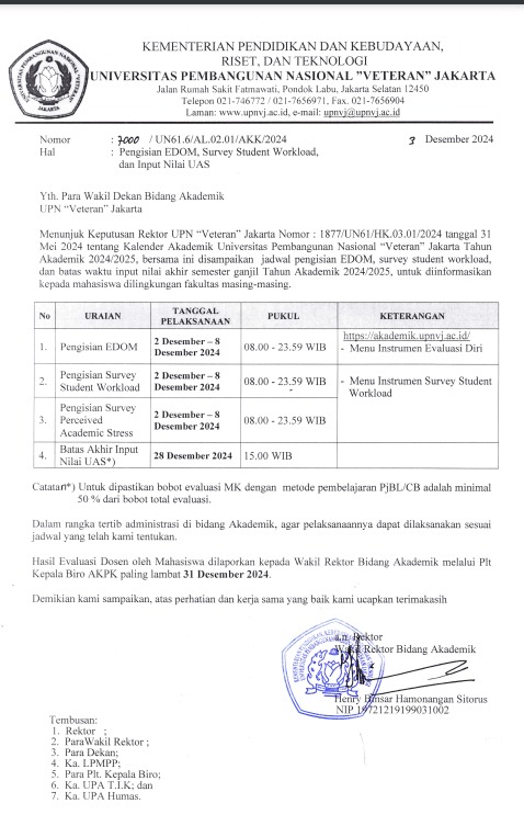 FIKES UPNVJ – Berdasarkan Nomor : 7000/UN61.6/AL.02.01/AKK/2024 tentang Pengisian EDOM, Survey Student Workload dan Input Nilai UAS Menunjuk Keputusan Rektor UPN "Veteran" Jakarta Tahun Akademik 2024/2025.