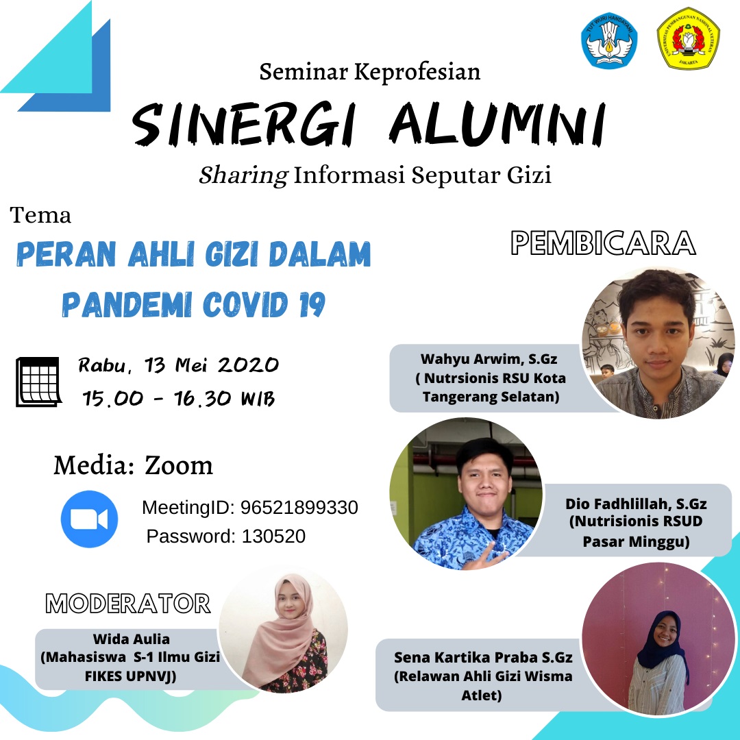 FIKES UPNVJ – Besok, Hari Rabu tanggal 13 Mei jam 15.00 WIB Program Studi Ilmu Gizi UPN Veteran Jakarta, akan mengadakan Seminar Keprofesian SINERGI (Sharing Informasi Seputar Gizi) ALUMNI denga tema Peran Ahli Gizi Dalam Pandemi Covid-19