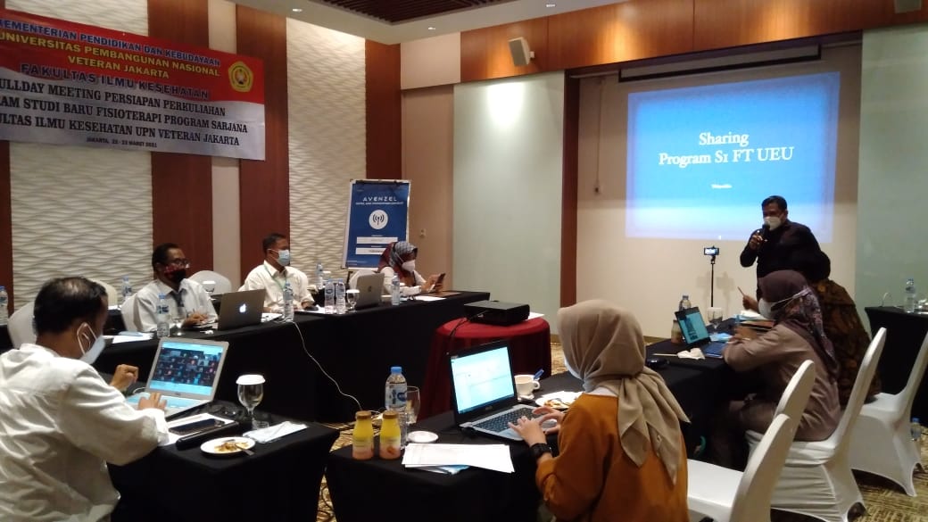 FIKES UPNVJ - Pada hari Senin 22 Maret 2021 Fakultas Ilmu Kesehatan Universitas Pembangunan Nasional Veteran Jakarta melaksanakan Kegiatan Persiapan Perkuliahan Program Studi Program Fisioterapi Program Sarjana di Avenzel Hotel and Convention Jalan Kranggan RT 002/ RW 016, Pondok Gede, Kec. Jatisampurna, Kota Bekasi Jawa Barat. Persiapan Perkuliahan Program Studi Program Fisioterapi Program Sarjana didampingi oleh Narasumber dari Pengurus Kolegium Ikatan Fisioterapi Indonesia Wahyuddin, SST.FT, M.Sc, Ph.D. Mata kuliah proses Fisioterapi menjadi mata kuliah inti bagaimana dalam proses Fisioterapi itu mahasiswa dituntut untuk berfikir teoritis. Salah satu contohnya adalah mata kuliah Evidence Based. Evidance Based adalah mata kuliah inti dan jika kita lihat dipendidikan profesi adalah mengkritisi artikel. Dalam konteks perkuliahan mahasiswa sudah diajarkan untuk menegakkan diagnosis, maka mereka dituntut untuk berfikir dan mengingat Clinical Prediction Rules. Mahasiswa dituntut untuk mampu menerapkan pemikiran logis, kritis, sistematis, dan inovativ dalam konteks pengembangan atau implementasi ilmu pengetahuan dan teknologi yang memperhatikan dan menerapkan nilai humaniora yang sesuai dengan bidang keahliannya. Serta mampu mengkaji implikasi dan pengembangan atau implementasi ilmu pengetahuan dan teknologi