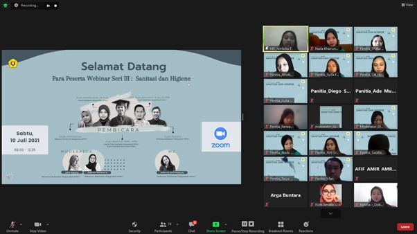 FIKES UPNVJ - Pada hari ini, Sabtu, 10 Juli 2021, Program Studi Kesehatan Masyarakat Program Sarjana telah melaksanakan Webinar Kesehatan Masyarakat Seri 1 dengan Topik Sanitasi Dasar. Webinar Seri 3 kali ini mengusung tema Sanitasi dan Higiene. Acara dilaksanakan melalui platform Zoom Meeting pukul 08.30—12.35 WIB serta dihadiri oleh 383 partisipan dari berbagai institusi dan kalangan masyarakat.