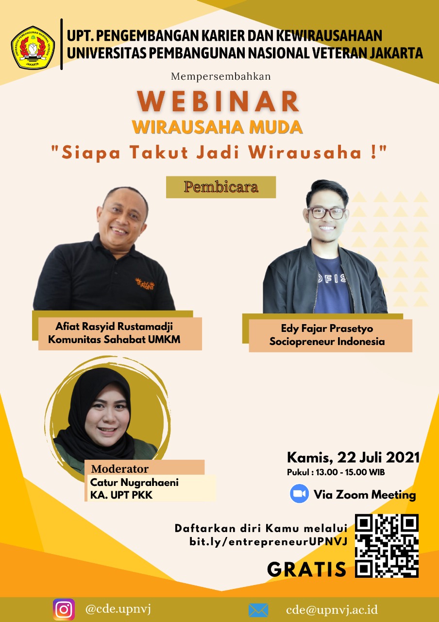 FIKES UPNVJ - [EVENT MAHASISWA] Kamu mahasiswa yang mau berwirausaha tapi masih bingung usaha apa, modal dari mana atau modal dan ide udah ada tapi belum berani memulai ? UPT. Pengembangan Karier dan Kewirausahaan Mempersembahkan - Webinar Kewirausahaan- Wirausaha Muda, “Siapa Takut jadi Wirausaha” menghadirkan