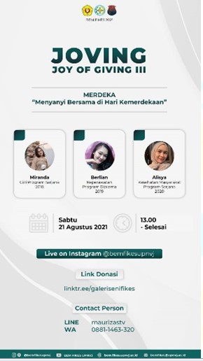 FIKES UPNVJ - Pada hari Sabtu, 21 Agustus 2021 pukul 13.00-14.00 WIB telah berlangsung kegiatan JOVING III : Joy of Giving III yang merupakan program kerja dari Departemen Seni Budaya BEM Fakultas Ilmu Kesehatan UPN Veteran Jakarta 2021 yang berkolaborasi dengan Biro Adkesma. Tujuan program kerja ini adalah untuk menyalurkan minat dan bakat Mahasiswa Fakultas Ilmu Kesehatan di bidang seni, khususnya Seni Musik (bernyanyi). Tidak hanya menyalurkan minat dan bakat mahasiswa, kegiatan ini juga membantu mahasiswa yang ingin berdonasi. Maka dari itu Departemen Seni Budaya berkolaborasi dengan Biro Adkesma yang memiliki Program Kerja 'Galang Utama'. Tujuan program kerja tersebut adalah untuk melakukan penggalangan dana yang nantinya akan dialokasikan untuk mahasiswa Fakultas Ilmu Kesehatan yang membutuhkan bantuan finansial, seperti untuk membayar UKT, membayar uang praktik dan sebagainya. Pada kali ini, JOVING III mengusung tema MERDEKA: ‘Menyanyi Bersama di Hari Kemerdekaa’. Tema tersebut diambil karena pelaksanaan kegiatan ini berdekatan dengan hari kemerdekaan serta untuk ikut memeriahkan suasana 17 Agustus walau hanya dari rumah.