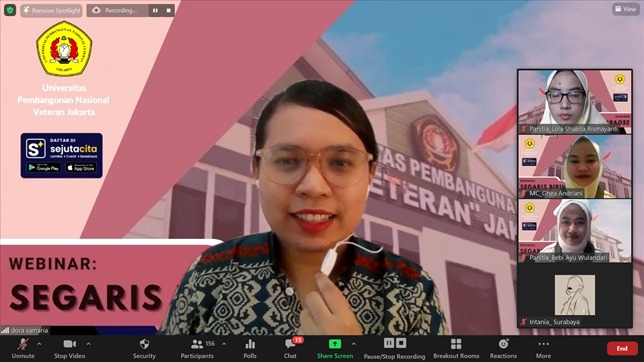 FIKES UPNVJ - Banyaknya perilaku seks berisiko pada remaja yang sedang ramai diperbincangkan di sosial media, membuat Mahasiswi Keperawatan Program Sarjana bergagas membuat Webinar "SEGARIS BIRU" (Kesehatan Reproduksi dan Gangguan Menstruasi Bincang Remaja Seru). Pada Jumat, 6 Agustus 2021 Webinar SEGARIS BIRU dapat terjalankan melalui Zoom Meeting diikuti oleh 186 peserta dari berbagai daerah di Indonesia. Kegiatan ini di hadiri oleh Ns. Dora Samaria S. Kep., M. Kep. selaku dosen koordinator Keperawatan Maternitas Klinik dan Ns. Desmawati M. Kep., Sp. Kep. Mat., PhD. selaku dosen pengampu Keperawatan Maternitas Klinik. Kegiatan ini dibuka oleh Master of ceremony, Ghea Andriani dilanjutkan dengan pembacaan doa dan pemutaran lagu Indonesia Raya dan Mars Bela Negara.