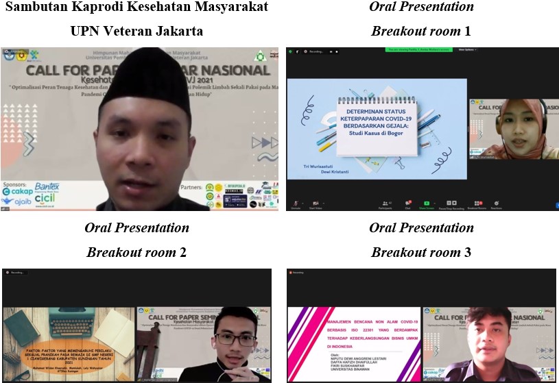 Kegiatan Call for Paper ini dipandu oleh Rizka Yuliana Rachman, mahasiswi aktif Program Studi Kesehatan Masyarakat Program Sarjana UPN Veteran Jakarta angkatan 2019 selaku MC. Rangkaian acara Call for Paper Seminar Nasional Kesehatan Masyarakat UPN Veteran Jakarta 2021 diawali dengan pembukaan, technical meeting dan tanya jawab, opening Oral Presentation, sesi foto bersama, mendengarkan lagu kebangsaan Indonesia Raya dan Mars Bela Negara, dilanjutkan dengan sambutan oleh Anggia Murti Adam selaku Ketua Pelaksana Call for Paper Seminar Nasional Kesehatan Masyarakat UPN Veteran Jakarta 2021, sambutan dari Junianto Patra selaku Ketua Himpunan Mahasiswa Kesehatan Masyarakat UPN Veteran Jakarta periode 2021/2022, dan sambutan dari Bapak Arga Buntara, SKM., MPH selaku Kepala Program Studi Kesehatan Masarakat UPN Veteran Jakarta. Acara dilanjutkan dengan Oral Presentation yang dibagi menjadi tiga breakout room. Pada setiap breakout room, dilakukan pemaparan materi oleh setiap tim dilanjut dengan sesi tanya jawab oleh reviewer dan audience yang dipandu oleh seorang moderator. Setelah pemaparan materi oleh setiap tim selesai, acara dilanjutkan di main room untuk penutupan dan pengisian evaluasi yang dipandu oleh MC.