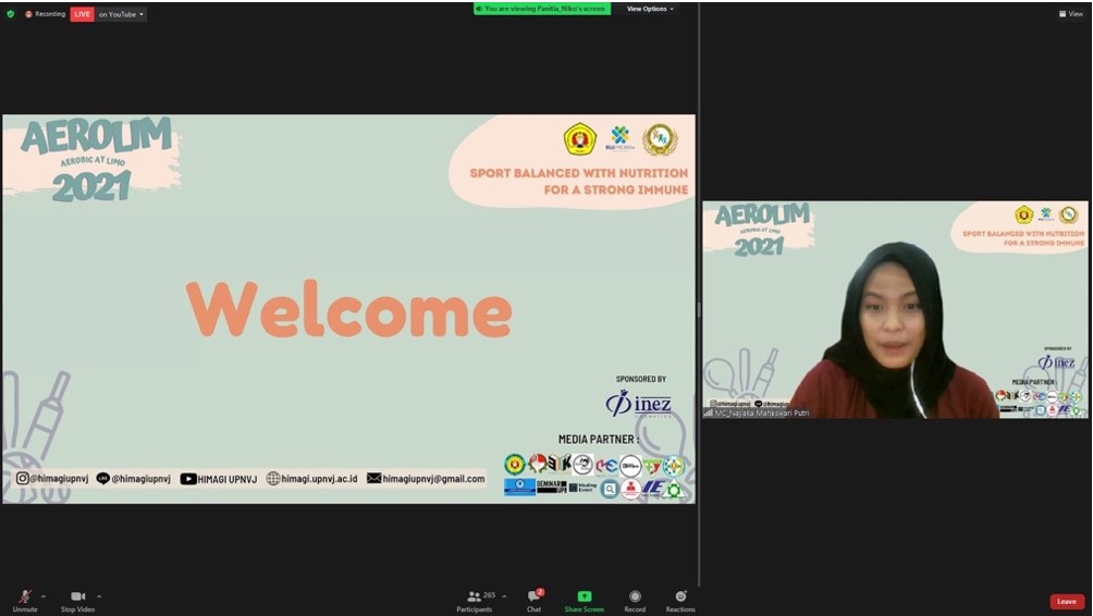 FIKES UPNVJ - Pada hari Sabtu, 4 september 2021- Dengan rasa bangga, Himpunan Mahasiswa Ilmu Gizi (HIMAGI) Universitas Pembangunan Veteran Jakarta telah mengadakan serangkaian kegiatan Aerobic at Limo (AEROLIM) 2021 dengan tema “Sport Balanced with Nutrition For A Strong Immune”. Aerobic at Limo (AEROLIM) merupakan acara webinar nasional yang diselenggarakan oleh Himpunan Mahasiswa Ilmu Gizi (HIMAGI) Periode 2020/2021 dan merupakan program kerja dari Divisi Kreasi, Seni dan Olahra (KREASOR) yang diselenggarakan pada tanggal 4 September 2021 secara daring melalui platform Zoom meeting.