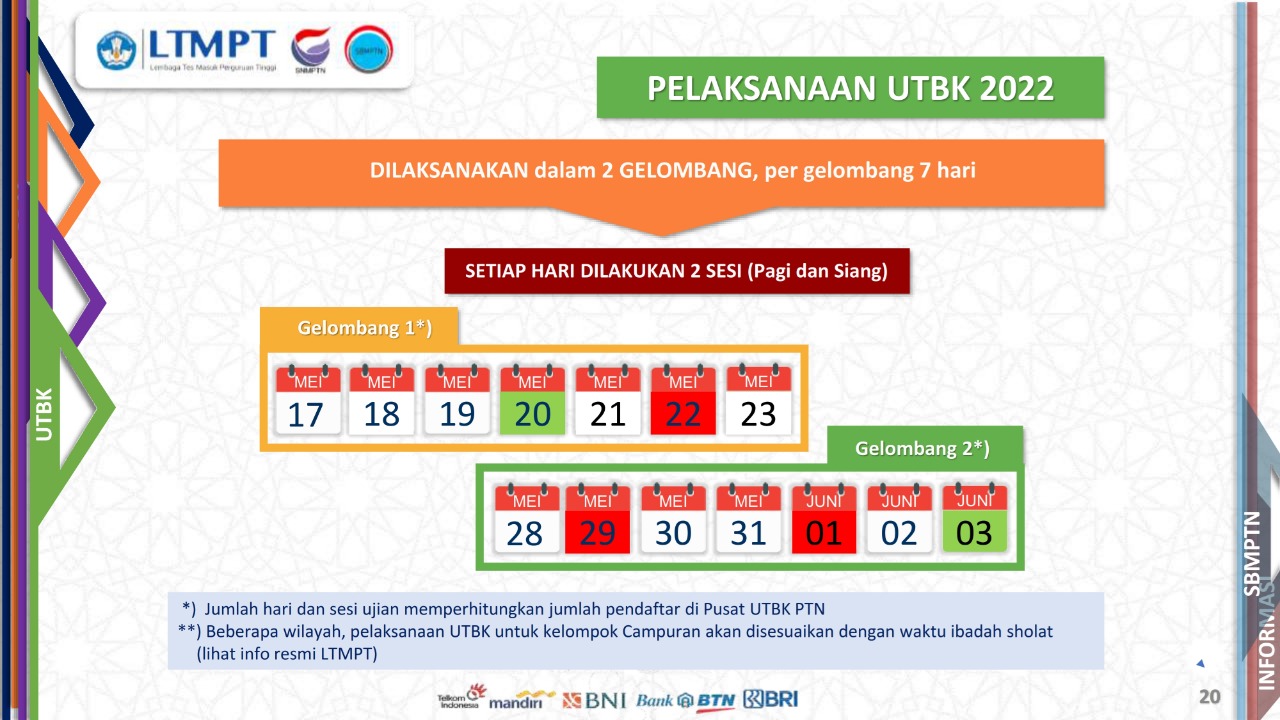 FIKES UPNVJ – Pelaksanaan Ujian Tulis Berbasis Komputer (UTBK) dalam rangka penerimaan mahasiswa baru sudah dimulai selama tujuh hari terhitung dari hari Minggu 17 Juni 2022. UTBK 2022 Tahap I dilaksanakan mulai 17 – 23 Mei 2022, sedangkan tahap II mulai 28 Mei – 3 Juni 2022. Untuk pelaksanaannya, UTBK dilaksanakan dua sesi per hari, yang berlangsung pada pukul 06:45 – 10:30 dan pukul 13:00 – 16:45.