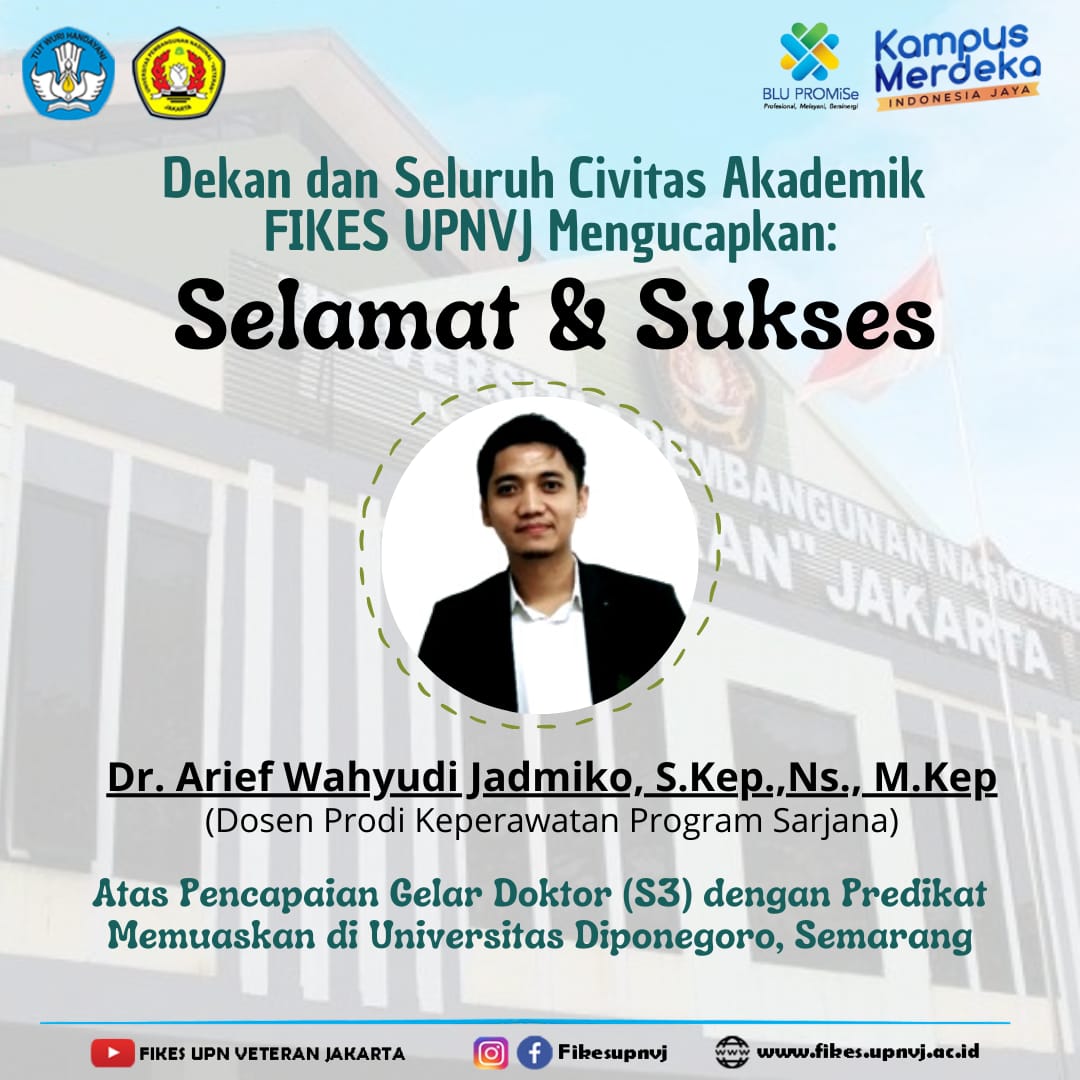 FIKES UPNVJ – Dekan dan Segenap Keluarga Besar Fakultas Ilmu Kesehatan UPN Veteran Jakarta Mengucapkan Selamat dan Sukses Kepada Dr. Arief Wahyudi Jadmiko, S. Kep., Ns., M. Kep. yang telah dinyatakan lulus program studi Doktor dari Universitas Diponegoro dengan predikat Sangat Memuaskan.