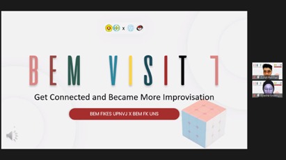 FIKES UPNVJ – Telah dilaksanakan kegiatan BEM Visit 1 BEM Fakultas Ilmu Kesehatan UPN Veteran Jakarta pada Hari Kamis, 30 Juni 2022 yang dilaksanakan secara online melalui Zoom Meeting. Kegiatan BEM Visit 1 kali ini dilaksanakan bersama BEM Fakultas Kedokteran Universitas Sebelas Maret dengan mengusung tema “Get Connected and Became More Improvisation”. Kegiatan ini dihadiri oleh seluruh pengurus BEM Fakultas Ilmu Kesehatan UPN Veteran Jakarta dan BEM Fakultas Kedokteran Universitas Sebelas Maret.