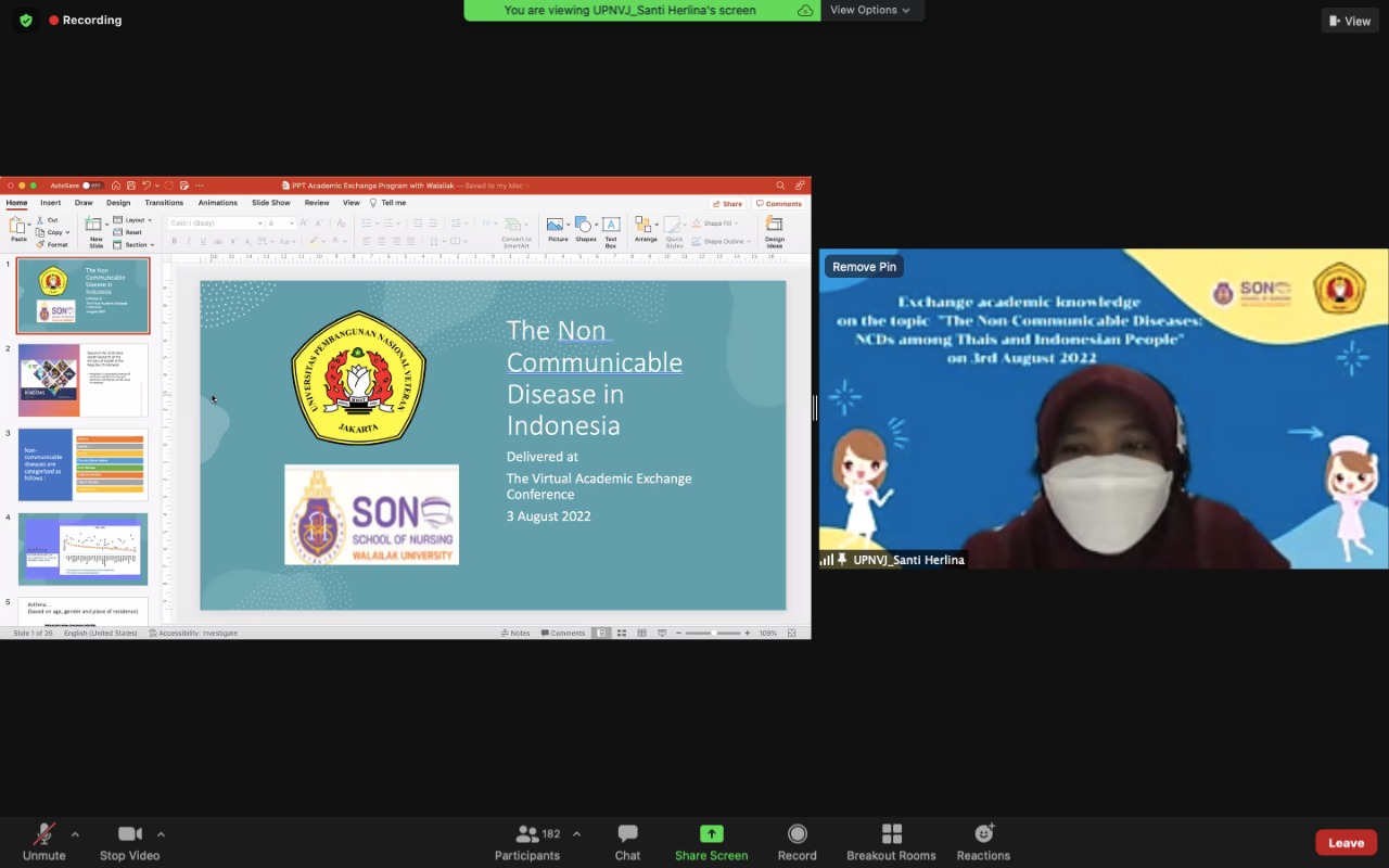 FIKES UPNVJ – Pada Tanggal 3 Agustus 2022 Program Studi Keperawatan Program Sarjana dan School of Nursing Walailak University mengadakan kegiatan Exchange Academic Knowledge on the Topiv The Non-Communicable Diseases dengan mahasiswa dan dosen dari school of nursing walailak university dan Prodi S1 Keperawatan UPN Veteran Jakarta.