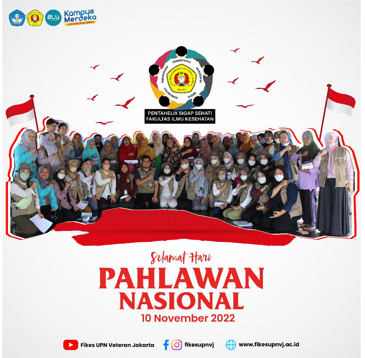 FIKES UPNVJ – Dekan dan Segenap Keluarga Besar Fakultas Ilmu Kesehatan Mengucapkan Selamat Hari Pahlawan Nasional 10 November 2022. Terima Kasih Kepada Pahlawan yang telah berkorban untuk bangsa ini, mari lanjutkan perjuangan pahlawan para pendiri Republik Indonesia untuk menjadi pribadi yang berani menerima tantangan dan lebih maju dalam segala bidang.
