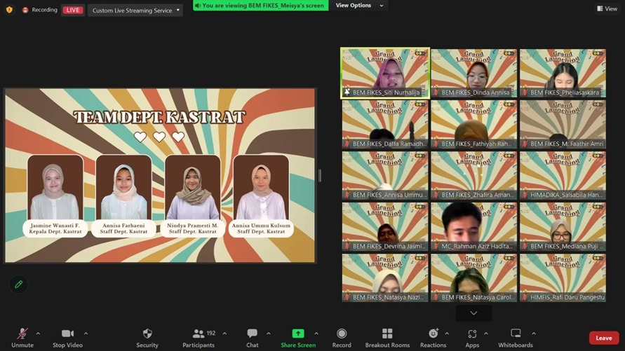 FIKES UPNVJ – Pada hari Minggu tanggal 26 Maret 2023, seluruh anggota BEM Fakultas Ilmu Kesehatan UPN “Veteran” Jakarta melaksanakan Kegiatan Grand Launching yang dihadiri oleh seluruh ORMAWA Fakultas Ilmu Kesehatan UPN “Veteran” Jakarta. Acara dimulai dengan menyanyikan lagu Indonesia Raya dan Mars Bela Negara. Peserta yang hadir terdiri dari seluruh anggota BEM Fakultas Ilmu Kesehatan UPN “Veteran” Jakarta, seluruh ORMAWA Fakultas Ilmu Kesehatan UPN “Veteran” Jakarta, dan mahasiswa aktif Fakultas Ilmu Kesehatan UPN “Veteran” Jakarta yang diadakan di platform Zoom Meeting dengan jumlah peserta 192 orang.