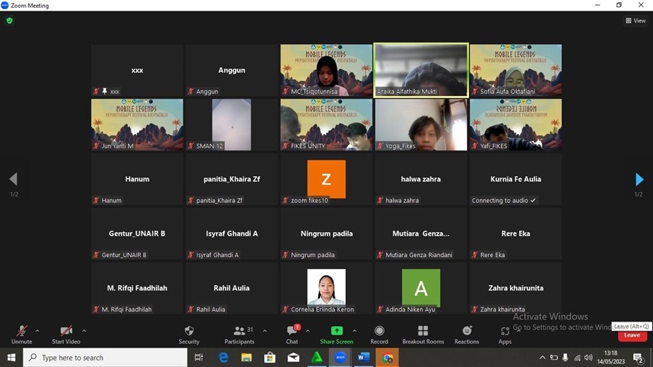 FIKES UPNVJ – Pada Minggu, 14 Mei 2023 telah dilaksanakan kegiatan Lomba Mobile Legends dalam acara Physiotherapy Festival Dies Natalis 2.0 dengan tema “Kembangkan Minat dan Bakatmu Menuju Generasi Milenial yang Unggul” yang dilaksanakan oleh Himpunan Mahasiswa Program Studi Fisioterapi Program Sarjana (HISFO) UPN “Veteran” Jakarta periode 2023/2024 secara online di Platform Zoom Meeting. Acara ini dilaksanakan untuk memperingati dua tahun pertama terbentuknya S1 Fisioterapi UPN “Veteran” Jakarta serta untuk menambah pengetahuan serta wawasan para peserta yang mengikuti lomba. Acara ini dipandu oleh Tsiqotunnisa Aulia selaku pembawa acara dari Lomba Mobile Legend yang diikuti oleh 35 peserta di dalam Platform Zoom Meeting, peserta yang mengikuti lomba tersebut terdiri dari mahasiswa fisioterapi dan siswa SMA.