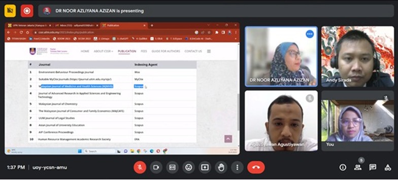 FIKES UPNVJ – Pada Rabu, 24 Mei 2023, para dosen jurusan Fisioterapi melakukan pemaparan partnership activities dengan University Teknologi Mara melalui zoom. Pertemuan ini merupakan tindak lanjut dari kerjasama antara Fakultas Ilmu Kesehatan UPN Veteran Jakarta dengan University Teknologi Mara. Rapat ini dihadiri oleh Bapak Agustiyawan, SST.FT., M.Fis., Ftr., AIFO (Wakil Dekan Bid. Kemahasiswaan dan Kerjasama), Ibu Farahdina Bachtiar, S.Ft., Physio., M.Sc., AIFO (Kepala Jurusan Fisioterapi), dan Bapak Andy Sirada, S.S.T., M.Fis., AIFO (Kepala Unit Kerjasama Luar Negeri FIKES UPNVJ).