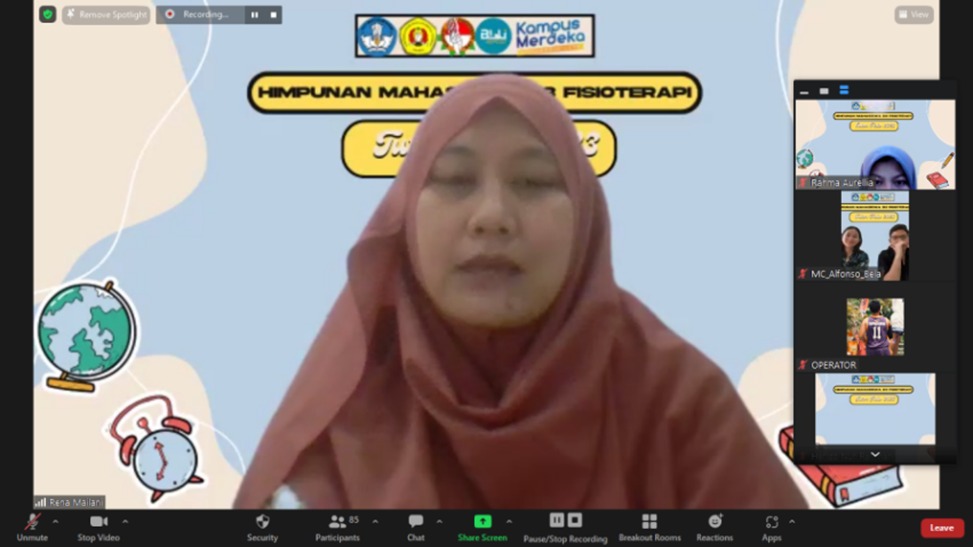 Kegiatan Tutor Fisio yang diselenggarakan secara online melalui Zoom Meeting berlangsung dari pukul 09.00-13.00 WIB. Kegiatan ini dipandu oleh Alfonso Oclind Gabe Damanik dan Bella Liena Ayuningrum yang merupakan mahasiswa/I aktif Program Studi Fisioterapi Program Diploma Fakultas Ilmu Kesehatan UPN “Veteran” Jakarta Angkatan 2022. Kegiatan ini dibuka dengan menyanyikan lagu kebangsaan Indonesia Raya serta Mars Bela Negara. Kemudian dilanjut oleh sambutan-sambutan hangat dari para yang terhormat, Kepala Program Studi Fisioterapi Program Diploma Tiga yaitu Ibu Rena Mailani, S.FT, M. Biomed, AIFO dan Kepala Jurusan Fisioterapi UPN “Veteran Jakarta” yaitu Ibu Farahdina Bachtiar, S.Ft, Physio, M.Sc. AIFO