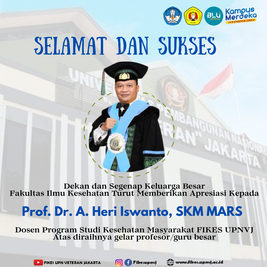 FIKES UPNVJ– Dekan dan Segenap Keluarga Besar Fakultas Ilmu Kesehatan UPN Veteran Jakarta Mengucapkan Selamat dan Sukses kepada Prof. Dr. A. Heri Iswanto, SKM MARS Dosen Program Studi Kesehatan Masyarakat FIKES UPN "Veteran" Jakarta Atas diraihnya Gelar Profesor / Guru Besar.