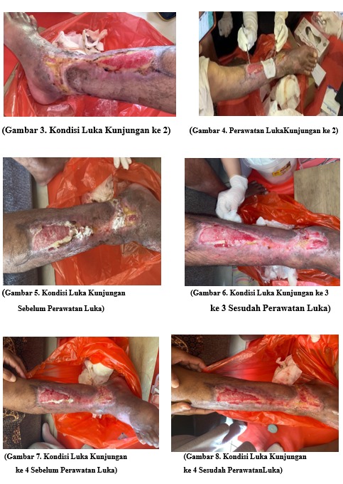 Sebelum melakukan perawatan luka, kelompok membagi tugas yaitu ada tim untuk memeriksa kadar gula darah pasien, melakukan pencucian, debridement, dan membalut luka, serta mengkaji luka. Kegiatan ini dimulai dengan perkenalan dan bina hubungan saling percaya pada pasien. Pemeriksaan kadar gula darah Tn. R dilakukan untuk melihat apakah gula darah pasien masih terkontrol atau tidak dikarenakan jika kadar gula darah pasien terlalu tinggi akan berpengaruh pada proses penyembuhan lukanya. Setelah itu kelompok memulai perawatan luka dengan membuka balutan pasien serta mencuci luka dengan menggunakan NaCl kemudian dilakukan pengkajian luka.