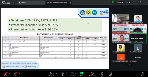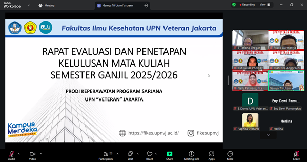 FIKES UPNVJ – Jurusan Keperawatan Fakultas Ilmu Kesehatan Universitas Pembangunan Nasional “Veteran” Jakarta melaksanakan Rapat Tinjauan Manajemen (RTM) Evaluasi Pembelajaran dan Kelulusan Semester Ganjil Tahun Akademik 2025/2026 pada Senin, 12 Januari 2026. Kegiatan ini diselenggarakan secara daring melalui Zoom Cloud Meetings dan diikuti oleh pengelola jurusan, pimpinan program studi, Gugus Kendali Mutu (GKM), serta para koordinator mata kuliah dari seluruh jenjang pendidikan.