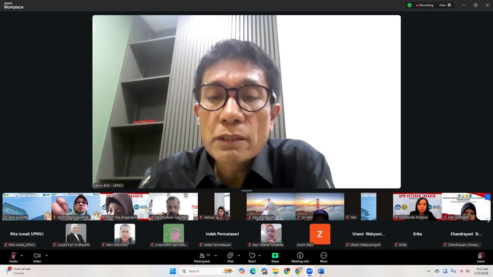 FIKES UPNVJ – Fakultas Ilmu Kesehatan Universitas Pembangunan Nasional “Veteran” Jakarta menyelenggarakan Rapat Koordinasi Agenda Rapat Persiapan Semester Genap TA. 2025/2026 (Plotting Dosen, Penanggung Jawab Mata Kuliah) pada hari Jumat, 23 Januari 2026 pukul 09.00 WIB secara daring melalui Zoom Meeting. Rapat dibuka oleh Wakil Rektor Bidang Akademik selaku Plt. Dekan FIKES Bapak Dr. Ir. Henry Binsar Hamonangan Sitorus, S.T., M.T., dan dilanjutkan oleh Wakil Dekan Bidang Akademik Fakultas Ilmu Kesehatan, Rita Ismail, S.Kp., M.K.M., MTD(HE)., Ph.D.