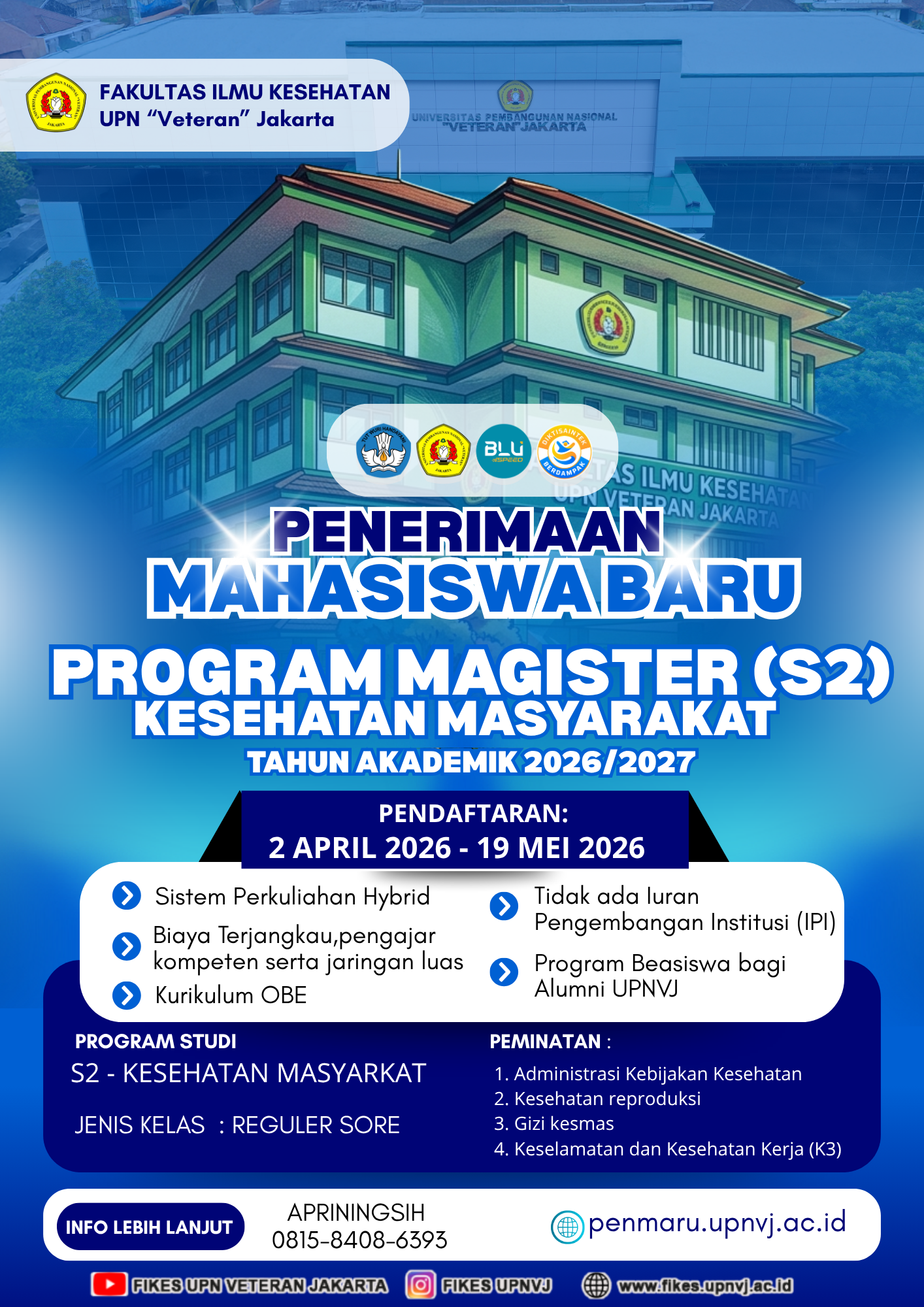 Fakultas Ilmu Kesehatan Universitas Pembangunan Nasional “Veteran” Jakarta (UPNVJ) resmi membuka penerimaan mahasiswa baru Program Magister (S2) Kesehatan Masyarakat Tahun Akademik 2026/2027. Pendaftaran berlangsung mulai 2 April hingga 19 Mei 2026 melalui sistem daring. Program ini ditujukan bagi lulusan sarjana yang ingin meningkatkan kompetensi di bidang kesehatan masyarakat dengan sistem perkuliahan hybrid. Berlokasi di kampus UPNVJ, program ini menawarkan kurikulum berbasis Outcome Based Education (OBE), tenaga pengajar kompeten, serta peluang beasiswa bagi alumni.