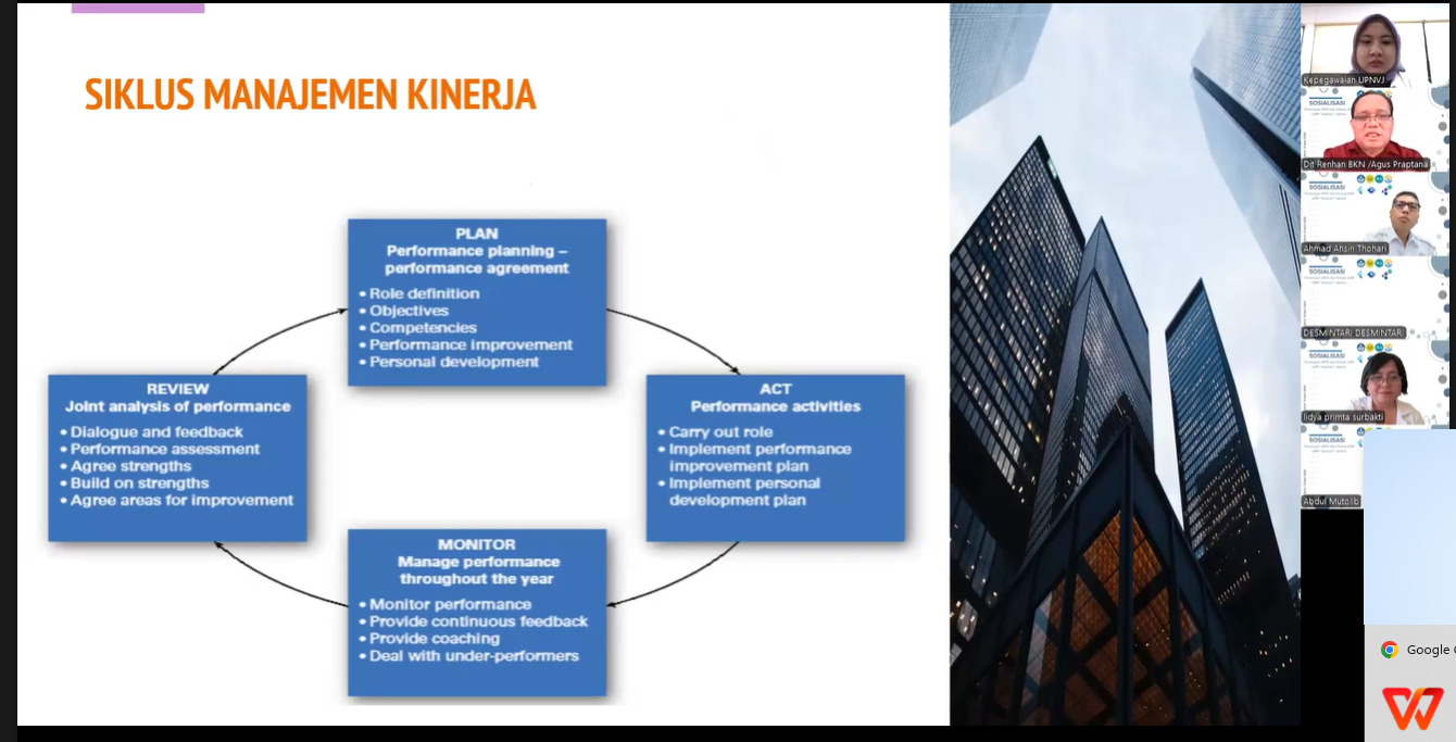 FIKES UPNVJ – Badan Kepegawaian Negara (BKN) menyelenggarakan sosialisasi terkait penerapan pola kerja fleksibel dan manajemen kinerja aparatur sipil negara (ASN) di lingkungan Universitas Pembangunan Nasional Veteran Jakarta pada Senin, 13 April 2026. Kegiatan ini membahas kebijakan terbaru mengenai Work From Home (WFH), Work From Office (WFO), serta sistem penilaian kinerja berbasis digital. Sosialisasi ditujukan bagi dosen dan tenaga kependidikan guna meningkatkan efektivitas kerja, efisiensi layanan, serta adaptasi terhadap transformasi digital birokrasi. Kegiatan berlangsung di Jakarta dengan menghadirkan narasumber dari BKN dan diikuti sivitas akademika UPNVJ.