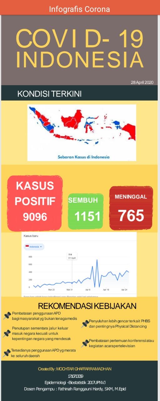 FIKES UPNVJ –Kondisi kasus covid-19 di Indonesia per 28 April 2020 masih terus mengalami kenaikan hingga mencapai angka 9096 kasus positif dan 675 orang meninggal. Disamping itu kasus yang sembuh juga terus mengalami kenaikan yang cukup pesat hingga kini lebih tinggi dari kasus meninggal yaitu 1151 kasus sembuh. Merujuk pada data tersebut, berikut adalah rekomendasi kebijakan yang bisa dijalankan