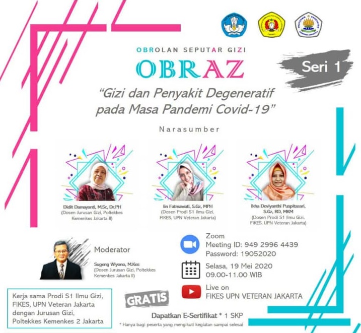 FIKES UPNVJ – WEBINAR OBRAS GIZI (Obrolan Seputar Gizi) Seri 1 yang merupakan kolaborasi antara Program Studi Ilmu Gizi, Fakultas Ilmu Kesehatan, UPN Veteran Jakarta Bekerja sama dengan Poltekkes Kemenkes Jakarta II Dengan tema yang sangat penting untuk sobat gizi ”Gizi dan Penyakit Degeneratif pada Masa Pandemi Covid-19”