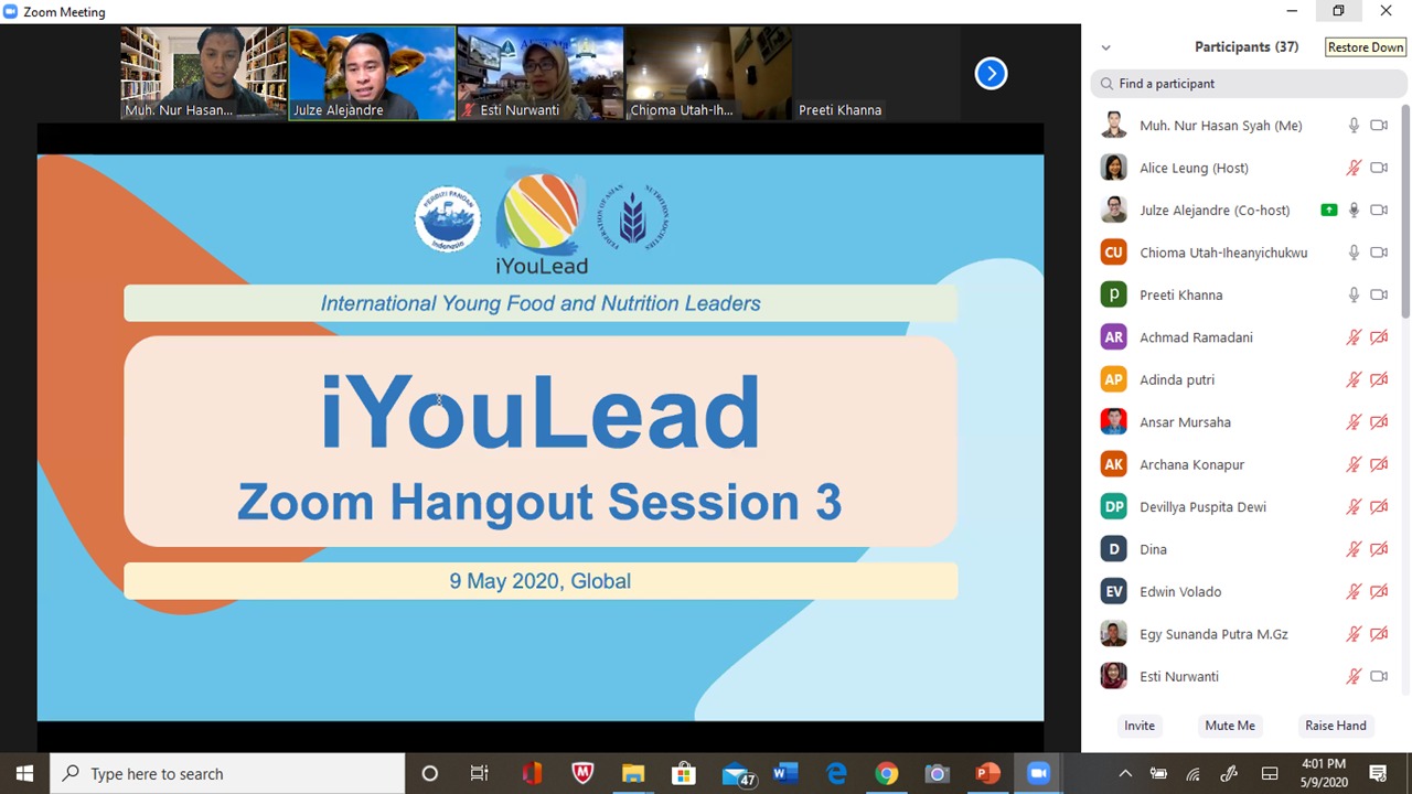 Kegiatan acara ini di hadiri oleh 47 peserta melalui Zoom yang diselenggarakan oleh International Young Food and Nutrition Leaders (IYouLead) peserta yang hadir terdiri dari Mancanegara Indonesia, Malaysia, India, Philiphina, Nigeria, Inggris, Australia, Laos dan Kamboja