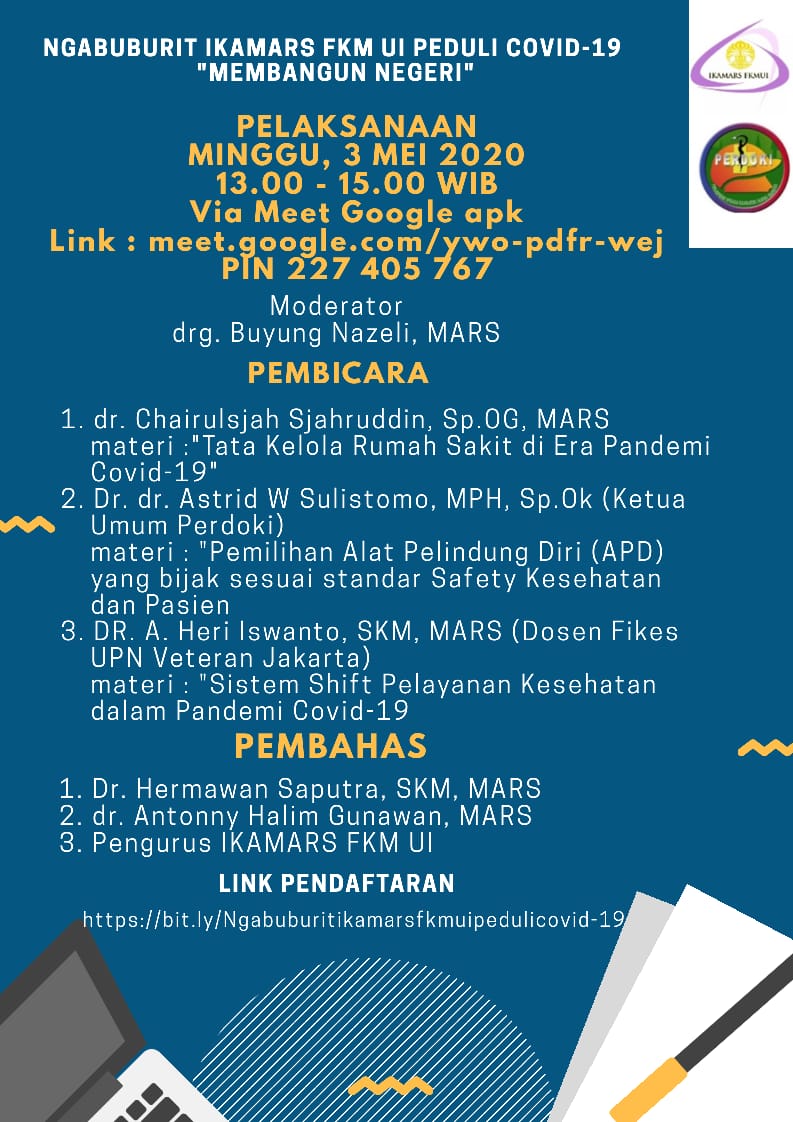 FIKES UPNVJ – Yuuu yang mau bergabung di acara Ngabuburit IKAMARS FKM UI Peduli Covid 19 "Membangun Negeri" Bisa bergabung di langsung di Link ini : meet.google.com/ywo-pdfr-wej PIN 227 405 767 dan untuk pendaftaran dapat klik Link ini https://bit.ly/Ngabuburitikamarsfkmuipedulicovid-19