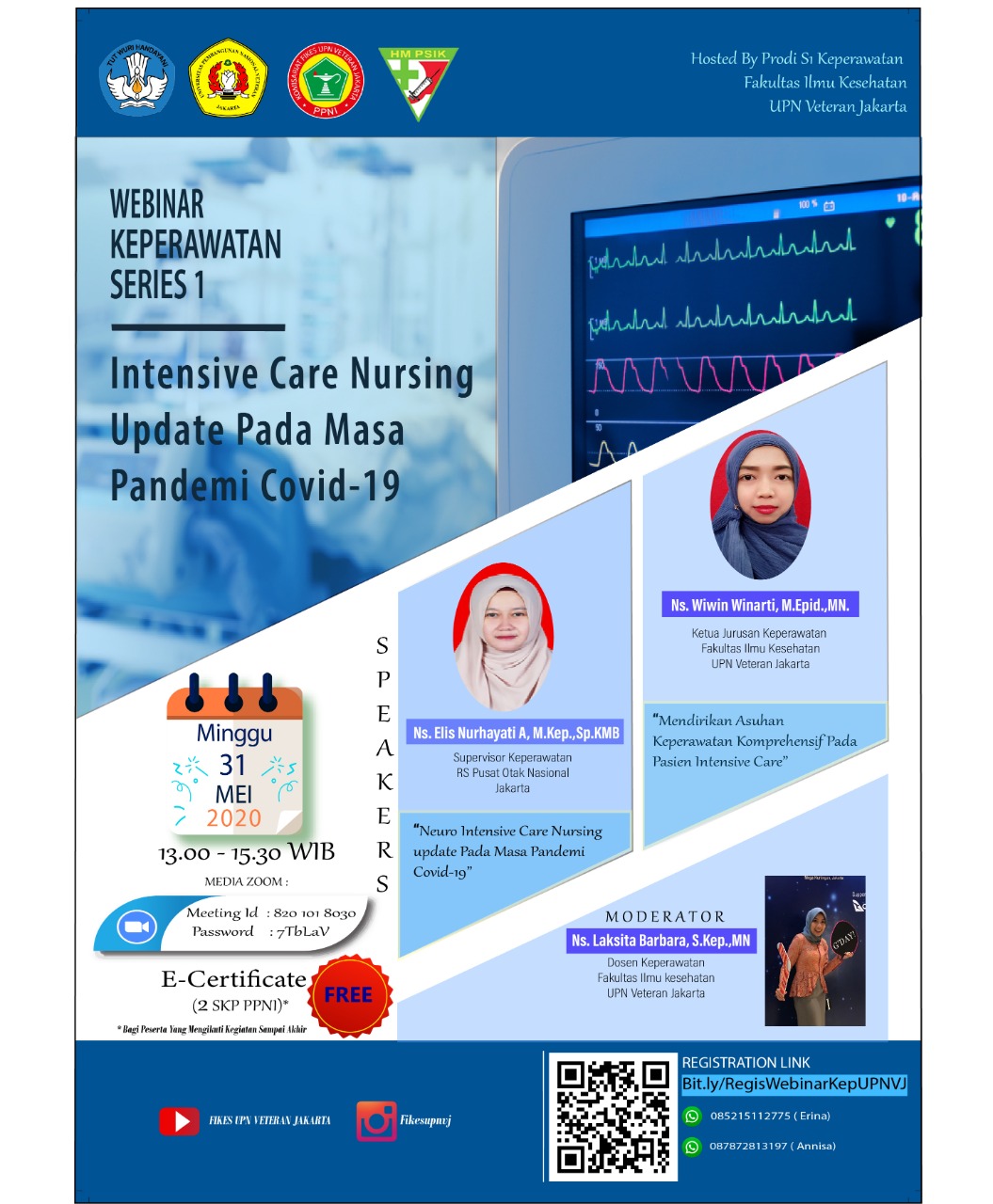 FIKES UPNVJ – Himpunan Mahasiswa Program Studi Ilmu Keperawatan bekerjasama dengan DPK PPNI Fakultas Ilmu Kesehatan Universitas Pembangunan Nasional Veteran Jakarta akan mengadakan Webinar Series Keperawatan Seri 1 Intensive Care Nursing Update Pada Masa Pandemi Covid-19