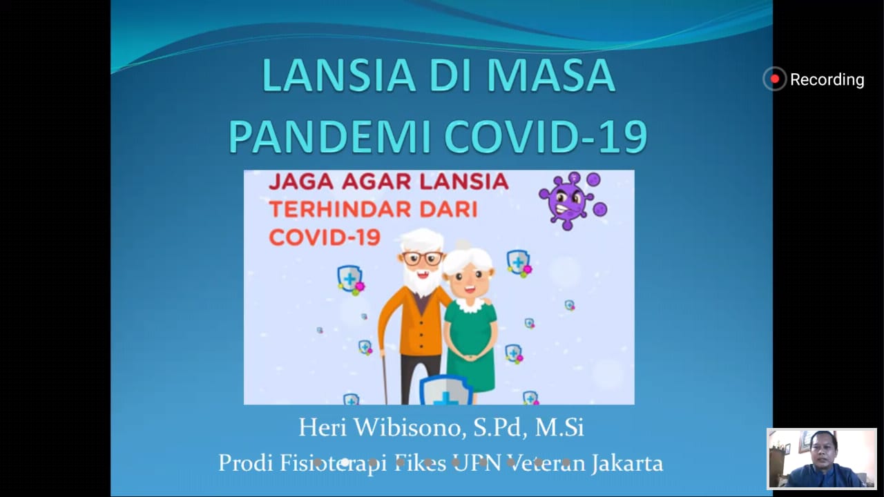 FIKES UPNVJ – Program Studi D-III Fisioterapi bekerjasama dengan Himpunan Mahasiswa Fisioterapi Universitas Pembangunan Nasional Veteran Jakarta telah melaksanankan WEBINAR SERIES Vol 2 PERAN FISIOTERAPI PADA MASA PANDEMI COVID-19 dengan tema "Geriatri, Kardiopulmonal, Olahraga". Acara dimulai dengan Moderator membacakan tata tertib webinar. Peserta yang mengikuti Webinar ini terdiri dari 182 Peserta. Acara di mulai dengan Pemberian Materi pertama yaitu :