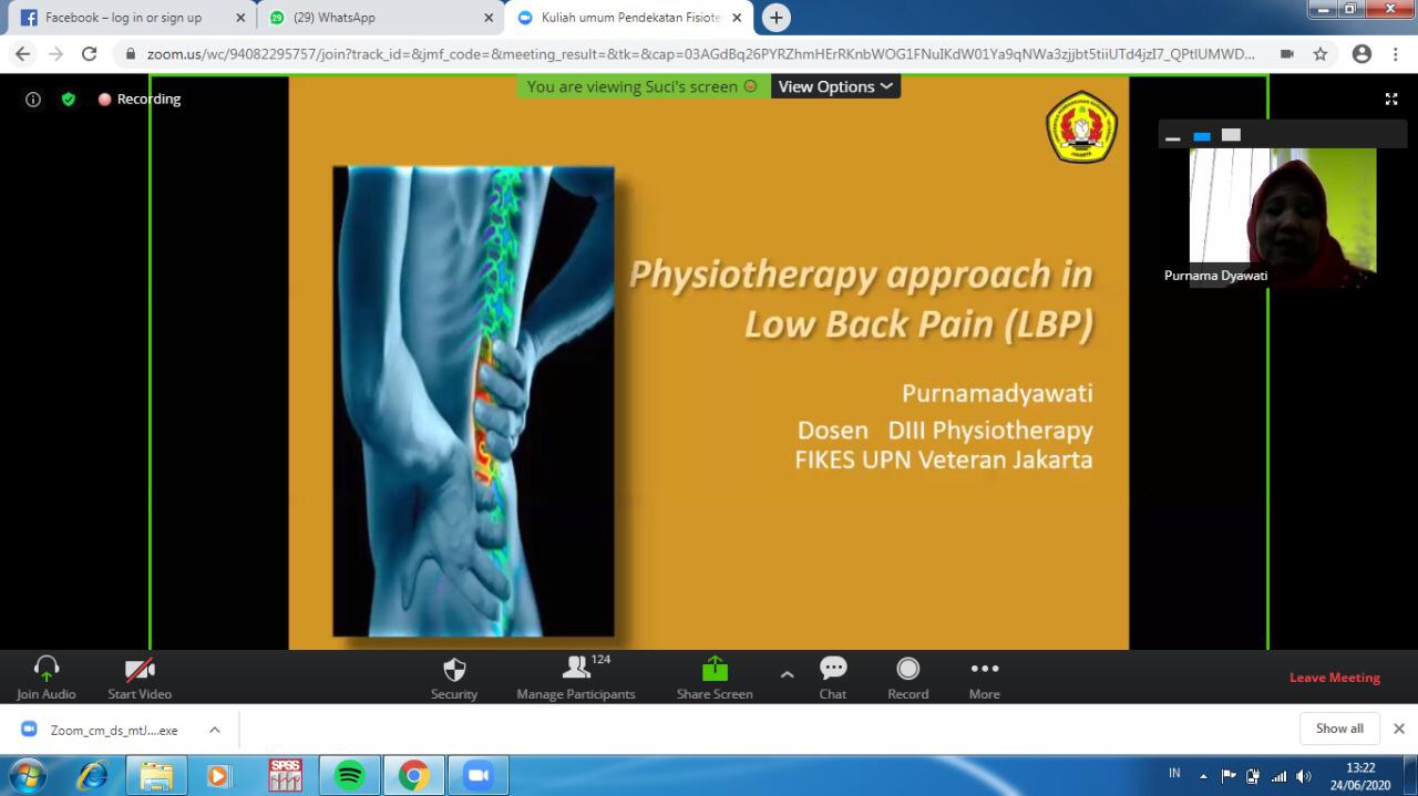 FIKES UPNVJ – Pada hari Rabu tanggal 24 juni 2020 Program Studi D-III Fisioterapi Fakultas Ilmu Kesehatan Universitas Pembangunan Nasional Veteran Jakarta telah melaksanakan Kuliah Umum dengan tema "Pendekatan Fisioterapi dalam Penanganan LBP". Acara dimulai oleh MC dalam pembacaan tata tertib Kuliah Umum. Kemudian Acara dilanjutkan dengan Sambutan dari Dekan Fakultas Ilmu Kesehatan Universitas Pembangunan Nasional Veteran Jakarta Dr. drg. Wahyu Sulistiadi, MARS.Peserta yang hadir dalam KUliah Umum terdiri dari mahasiswa Fisioterapi Fakultas Ilmu Kesehatan Universitas Pembangunan Nasional Veteran Jakarta yang terdiri dari 175 peserta. Kemudian acara dilanjutkan oleh moderator Farahdina Bachtiar, S.Ft.,Physio,M.Se (Dosen Fisioterapi FIKES UPN Veteran Jakarta) pembacaan CV Narasumber pertama yaitu Purnamadyawati, SST.Ft.,M.Fis ( Dosen Fisioterapi FIKES UPN Veteran Jakarta)