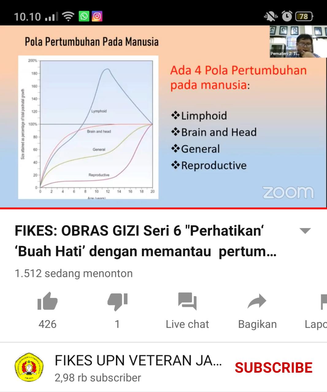 FIKES UPNVJ – Pada hari Jum'at tanggal 26 Juni 2020 Program Studi Ilmu Gizi, Fakultas Ilmu Kesehatan, Universitas Pembangunan Nasional Veteran Jakarta Bekerja sama dengan Poltekkes Kemenkes Jakarta II telah melaksanakan Webinar OBRAS Gizi 6 Perhatian 'Buah Hati' dengan Memantau Pertumbuhan Secara Mandiri". Peserta yang hadir terdiri dari 300 peserta melalui zoom dan peserta live youtube 2107 total keseluruhan yaitu 2407. Acara dimulai dengan Pembukaan yang dibawakan oleh MC dalam pembacaan tata tertib webinar OBRAS GIZI Seri 6 lalu acara dilanjutkan oleh Maoderator M. Ikhsan Amar, S.Gz, M.Kes (Dosen Prodi S1 Ilmu Gizi, FIKES, UPN Veteran Jakarta). Moderator membacakan CV dari Narasumber pertama yaitu Dr. Moesijanti Y. E . Soekatri, MCN (Dosen Jurusan Gizi, Poltekkes Kemenkes Jakarta II) "Normalkah Pertumbuhan dan Perkembangan Si BUah Hati (Balita) ?" Materi yang disampaikan yaitu