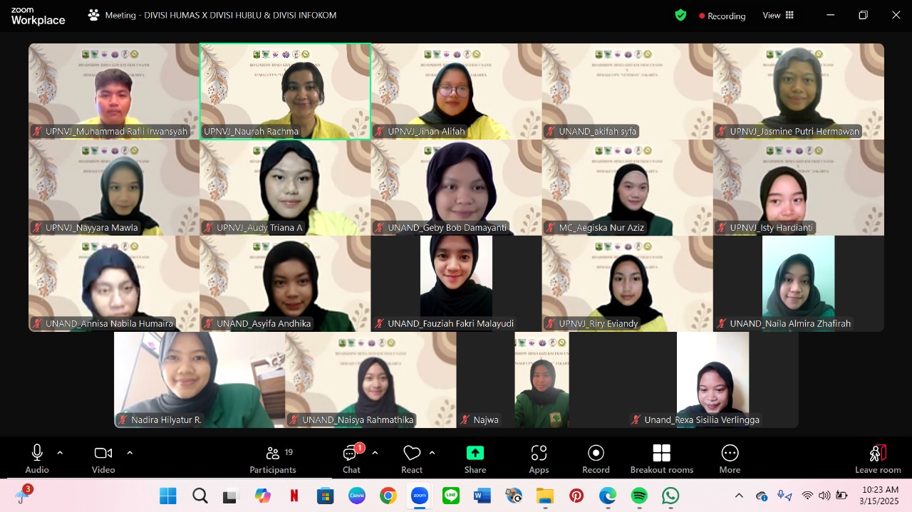 FIKES UPNVJ – Depok, 15 Maret 2025 – Dengan rasa bangga, Himpunan Mahasiswa Gizi (HIMAGI) Fakultas Ilmu Kesehatan Universitas Pembangunan Nasional “Veteran” Jakarta telah mengadakan kegiatan Studi Banding bersama Himpunan Mahasiswa Gizi (HIMA GIZI) Keluarga Mahasiswa Fakultas Kesehatan Masyarakat Universitas Andalas. Studi Banding merupakan salah satu fungsional dari Divisi Humas yang bertujuan untuk berbagi sudut pandang antara Himpunan Mahasiswa Gizi (HIMAGI) Fakultas Ilmu Kesehatan Universitas Pembangunan Nasional “Veteran” Jakarta dengan organisasi mahasiswa lain mengenai struktur kepengurusan dan program kerja dari masing-masing organisasi. Kegiatan ini diselenggarakan oleh Himpunan Mahasiswa Gizi (HIMAGI) Periode 2024/2025 bersama dengan Himpunan Mahasiswa Gizi (HIMA GIZI) Keluarga Mahasiswa Fakultas Kesehatan Masyarakat Universitas Andalas pada tanggal 15 Maret 2025 melalui platfrom Zoom Meeting.
