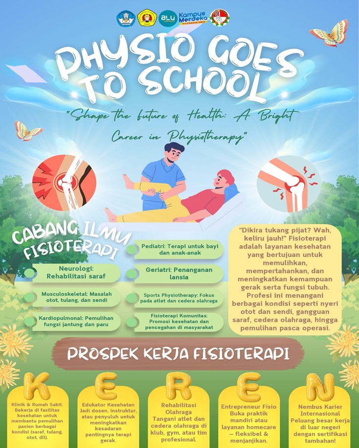FIKES UPNVJ – Telah terselenggara kegiatan Physio Goes To School pada hari Sabtu, 8 Februari 2025; Selasa, 22 April 2025; Rabu, 23 April 2025; Senin, 28 April 2025; Selasa, 29 April 2025; serta Selasa, 6 Mei 2025. yang dilaksanakan secara online melalui platform Zoom Meeting dan juga dilaksanakan dengan mendatangi sekolah-sekolah, diantaranya SMAN 34 Jakarta, SMA PGRI 3 Jakarta, SMAN 108 Jakarta dengan tema “Shape The Future Of Health A Bright Career In Physiotherapy”. Kegiatan Physio Goes To School merupakan salah satu program kerja yang diadakan oleh Departemen Sosial Masyarakat yang bertujuan untuk memperkenalkan Program Studi Fisioterapi. Kegiatan ini memberikan wadah kepada siswa/i dalam bentuk sosialisasi dan tanya jawab mengenai Program Studi Fisioterapi khususnya Program Diploma Tiga Fakultas Ilmu Kesehatan UPN “Veteran” Jakarta.